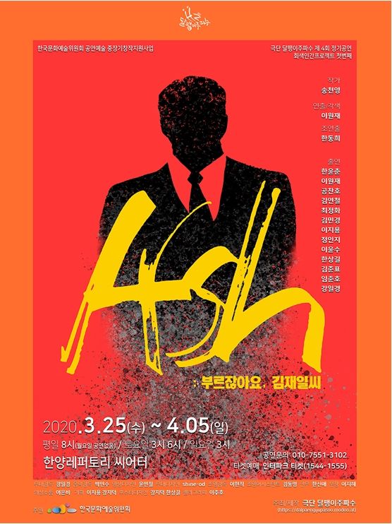 [아시아경제 박병희 기자] 극단 달팽이주파수가 제4회 정기공연 '애쉬(Ash)-부르잖아요, 김재일씨'를 오는 3월25일~4월5일 대학로 한양레퍼토리씨어터에서 공연한다.