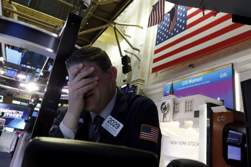 9일 개장한 뉴욕 증시가 7%대 폭락을 기록하면 거래가 정지되자 한 주식 증개인이 얼굴을 손으로 가린채 당황해 하고 있다. [이미지출처=AP연합뉴스]