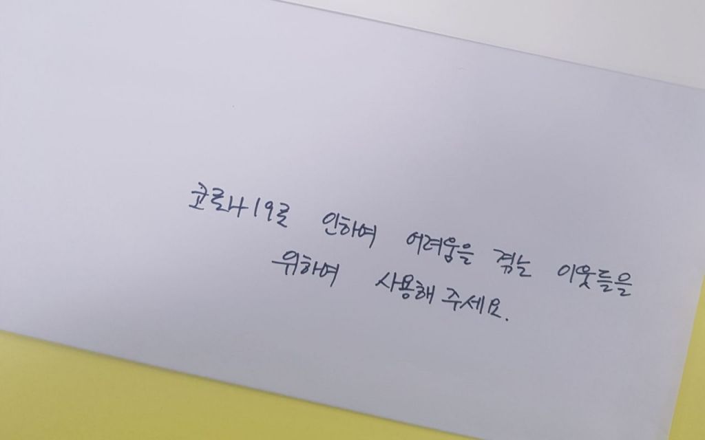 다시 바통을 이은 사람은 익명의 독지가이다. 그는 “코로나19로 인해 어려움을 겪는 이웃들을 위해 사용해 주세요” 라고 적힌 하얀 편지봉투를 내밀었다. 편지 봉투에는 50만원이 들어 있었다.