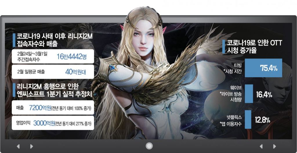[아시아경제 이진규 기자, 구채은 기자] #1. 직장인 김형석(35)씨는 11일이면 재택근무 3주차에 들어간다. 3주 사이 김씨 일상엔 많은 변화가 생겼다. 평일 주말 가릴 것 없이 집에서만 시간을 보내다보니, 유튜브를 보거나 게임을 즐기는 시간이 크게 늘었다. 김 씨는 특히 근무시간에는 꿈도 못 꿨던 엔씨소프트의 '리니지2M'을 맘껏 즐기고 있다. 다른 직원들의 눈치를 볼 필요 없이 업무 중에는 자동전투(캐릭터가 자동으로 전투해 레벨을 올리는 것) 모드로 설정해놓고, 쉬는 시간을 활용해 틈틈이 게임을 즐기고 있다.