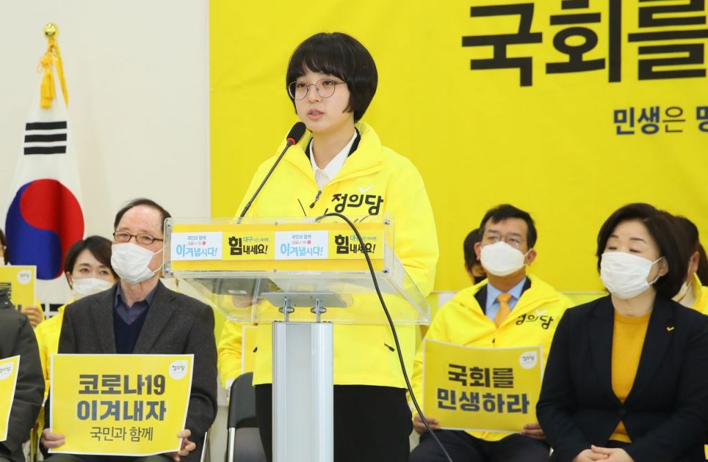 정의당 비례대표 1번인 류호정 청년 공동선대위원장이 11일 국회에서 열린 코로나 19 민생위기 극복 선거대책위원회 발족식에서 발언하고 있다. [이미지출처=연합뉴스]