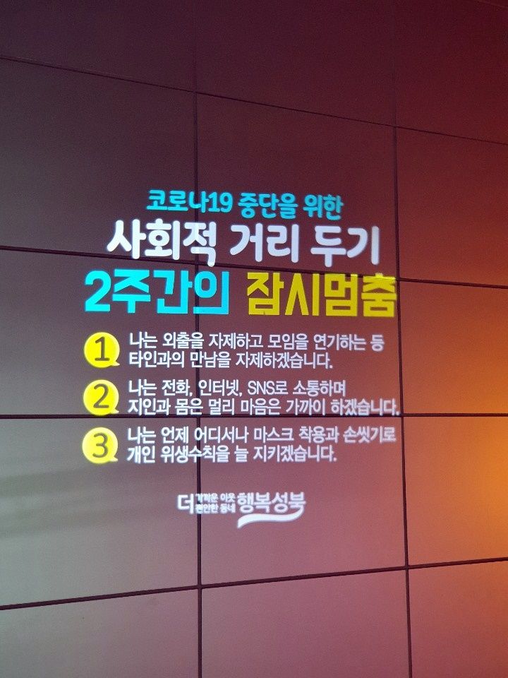 정릉2동주민센터는 ‘잠시 멈춤’에 대한 주민의 공감대를 높이고 자발적인 동참을 이끌어 내기 위해 기존에 설치한 로고라이트를 활용해 주민센터 벽면을 ‘잠시 멈춤’ 메시지로 채웠다.