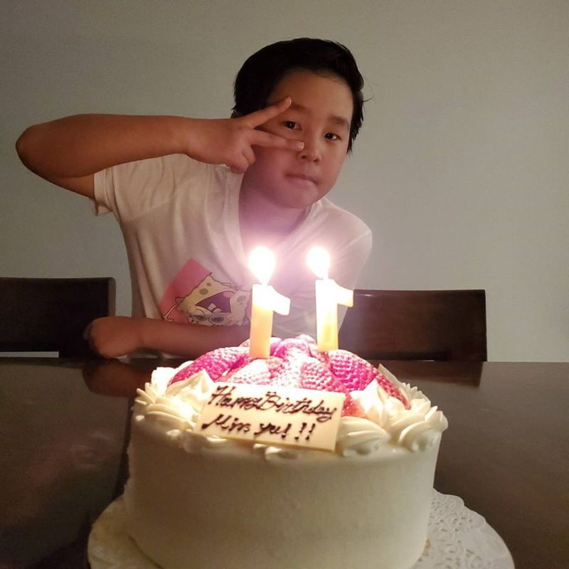 사진 속에서 민율 군은 자신의 나이를 의미하는 '11'이라는 숫자 초가 꽂힌 케이크 앞에서 해맑게 '브이' 포즈를 취했다.