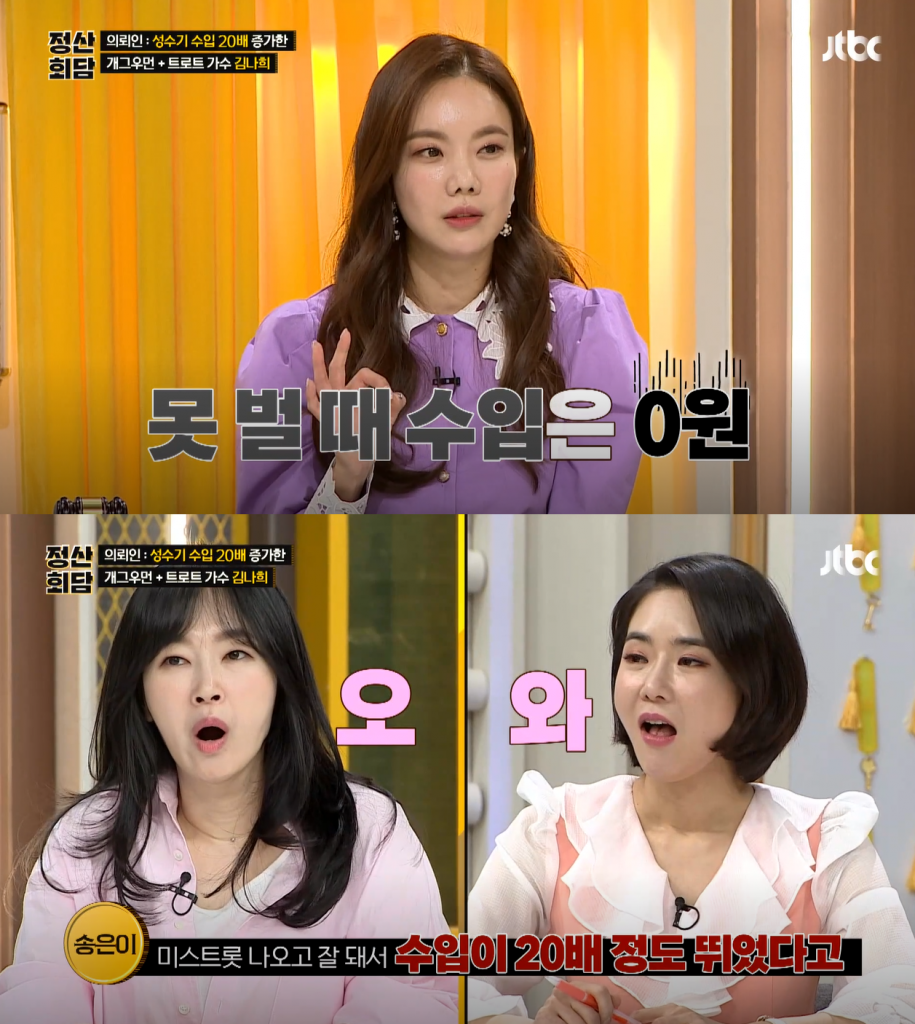 이날 방송에서 김나희는 TV 조선 '미스트롯' 출연 이후 수입에 큰 변화가 생겼다고 밝혔다. 김나희는 "개그우먼 생활할 때는 코너가 없으면 수입이 0원이었다"며 "평균적으로 치면 월 200만원을 벌었다. 그렇게 6~7년 정도 생활했다"고 운을 뗐다.