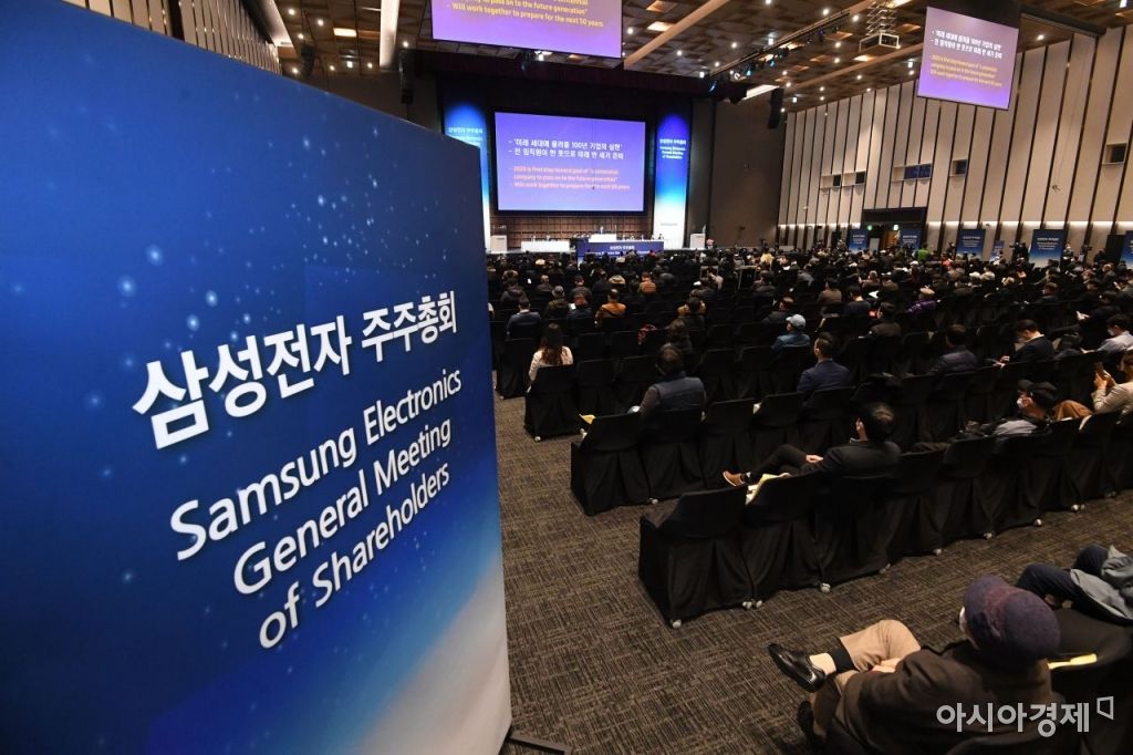 18일 경기도 수원시 수원컨벤션센터에서 열린 삼성전자 제51기 정기주주총회가 열리고 있다. 삼성은 이번 주주총회에서 신종 코로나바이러스감염증 확산을 방지하기 위해 1969년 창사 이후 처음으로 전자투표제를 도입했다./수원=강진형 기자aymsdream@