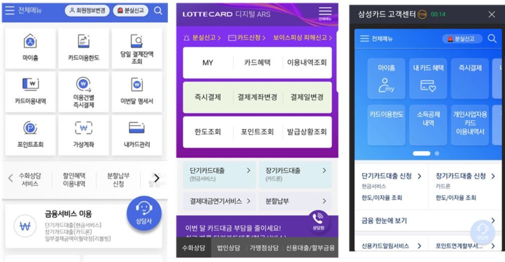 신한카드와 롯데카드 말고도 삼성·KB국민·현대·우리·하나카드 콜센터에도 전화를 걸어 ARS 서비스를 이용해 봤는데요. 삼성카드도 디지털 ARS 서비스를 운영하고 있었고, 나머지 카드사들도 음성 ARS, 버튼식 ARS뿐 아니라 '보이는 ARS'를 통해 화면을 보면서 간단한 상담 업무들을 처리할 수 있는 서비스를 제공하고 있었습니다. 서비스 내용은 대동소이 하고요.