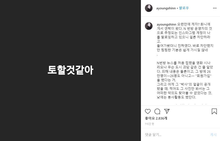 신아영 아나운서는 자신의 인스타그램에 "토할 것 같아"라고 적힌 사진을 게재했다. 신 아나운서는 "오랜만에 제자에게서 연락이 왔다. N번방 운영자의 것으로 추정되는 인스타그램 계정이 나를 팔로잉하고 있으니 얼른 차단하라고"라며 "들어가 봤더니 진짜였다. 바로 차단했지만 찜찜한 기분은 쉽게 가시질 않는다"라고 분노했다.