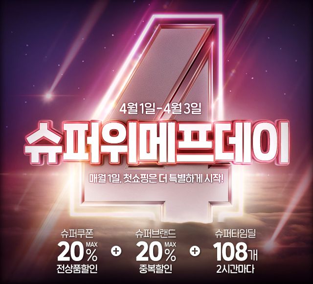 카테고리별 중복 쿠폰 할인 혜택도 제공한다. 슈퍼브랜드관 20% 할인과 중복 적용하면 최대 40%까지 혜택을 받을 수 있다. 슈퍼위메프데이 핵심 코너인 타임딜은 2시간마다 테마별로 3개씩 오픈하며 3일간 총 108개 초특가상품을 선보인다.