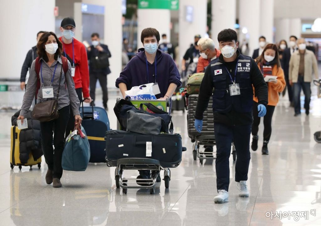26일 인천국제공항 2터미널에서 영국 런던발 여객기를 타고 입국한 무증상 외국인이 코로나19 진단 검사를 받기 위해 옥외공간에 마련된 개방형 선별진료소(오픈 워킹스루형·Open Walking Thru)로 이동하고 있다. /문호남 기자 munonam@