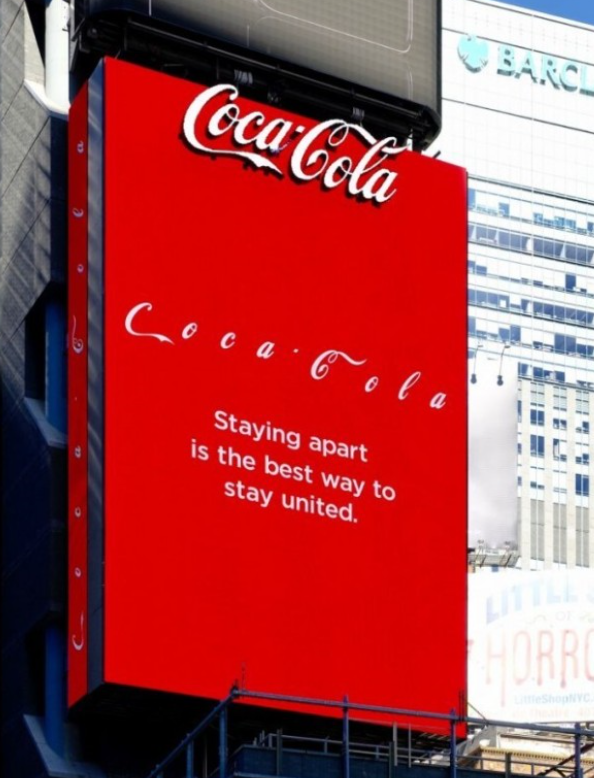 코카콜라는 뉴욕 맨해튼 타임스스퀘어에 있는 전광판에 사회적 거리두기를 호소하는 광고를 실었다. 자사의 로고인 'Coca Cola'의 알파벳 간격을 넓게 띄운 뒤 아래에 "떨어져 있는 것은 연결을 유지하기 위한 최선의 방법"이라는 문구를 함께 노출한 것이다.