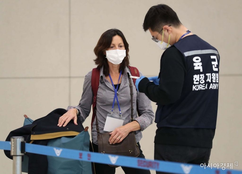 26일 인천국제공항 2터미널에서 영국 런던발 여객기를 타고 입국한 무증상 외국인이 옥외공간에 마련된 개방형 선별진료소(오픈 워킹스루형·Open Walking Thru)에서 코로나19 진단 검사를 받기 전 육군 현장지원팀 관계자에게 안내를 받고 있다. /문호남 기자 munonam@