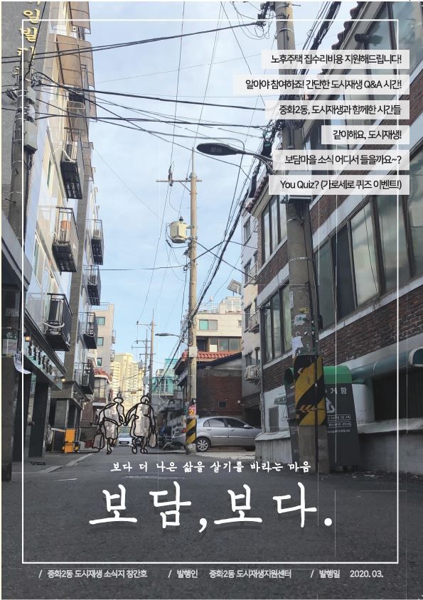 ‘보담,보다’는 중화2동 도시재생지원센터에서 도시재생활성화지원 코디네이터(아트버스킹)와 주민들로 구성된 인턴 코디네이터들이 함께 힘을 모아 발행한 소식지로 현재 추진 중인 중화2동 도시재생에 대한 소식들로 구성돼 있다.