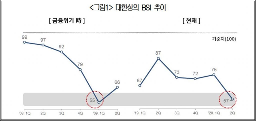 이에 따라 수출기업과 내수기업의 체감경기전망은 모두 큰 폭으로 떨어졌다. 2분기 수출기업의 경기전망지수는 63으로 전분기보다 25포인트 하락했으며, 내수부문은 56으로 15포인트 떨어졌다.