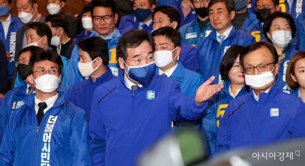 제21대 국회의원선거 공식 선거운동이 시작된 2일 서울 여의도 국회에서 열린 '더불어민주당-더불어시민당 21대 총선 중앙선대위 합동 출정식'에 참석한 이해찬 더불어민주당 대표, 이낙연 더불어민주당 상임선거대책위원장, 최배근 더불어시민당 상임공동선대위원장이 출정식을 마친 뒤 이동하고 있다./강진형 기자aymsdream@