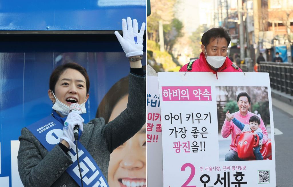 제21대 국회의원선거 서울 광진을에 출마한 고민정 더불어민주당 후보(왼쪽)가 6일 자양동 건대입구역 앞에서, 오세훈 미래통합당 후보가 뚝섬유원지역 앞에서 출근길 시민들에게 지지를 호소하고 있다. [이미지출처=연합뉴스]