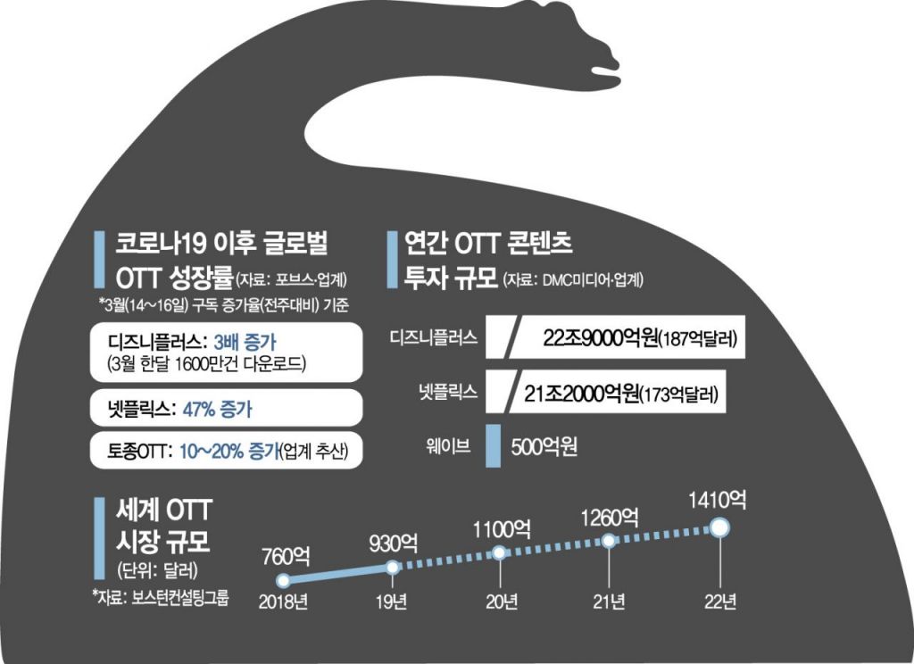 [아시아경제 구채은 기자] 신종 코로나바이러스감염증(코로나19) 여파로 디즈니플러스, 넷플릭스 등 글로벌 온라인동영상서비스(OTT) 공룡들의 세 확장이 매섭다. 탄탄한 독점 콘텐츠를 통한 물량공세와 막강한 자본력으로 시장을 빠르게 확대해가고 있는 것이다.