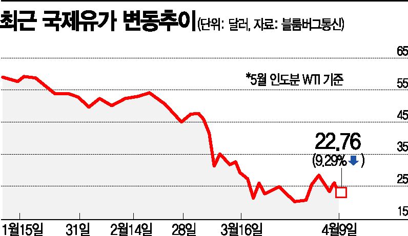 원유시장에서는 이날에만 OPEC+의 감산 규모가 최대 2000만배럴에 달할 것이라는 소문도 돌았다. 이 때문에 개장 직후 유가가 급등하기도 했다. 하지만 하루 1000만배럴로 잠정 합의됐다는 소식에 유가는 다시 하락했다. 뉴욕상업거래소(NYMEX)에서 5월 인도분 서부 텍사스산원유(WTI)는 장중 한때 12% 올라 28.36달러를 기록했지만, 1000만배럴 감산 소식이 전해진 후에는 9.3% 내린 배럴당 22.76달러에 거래를 마쳤다.