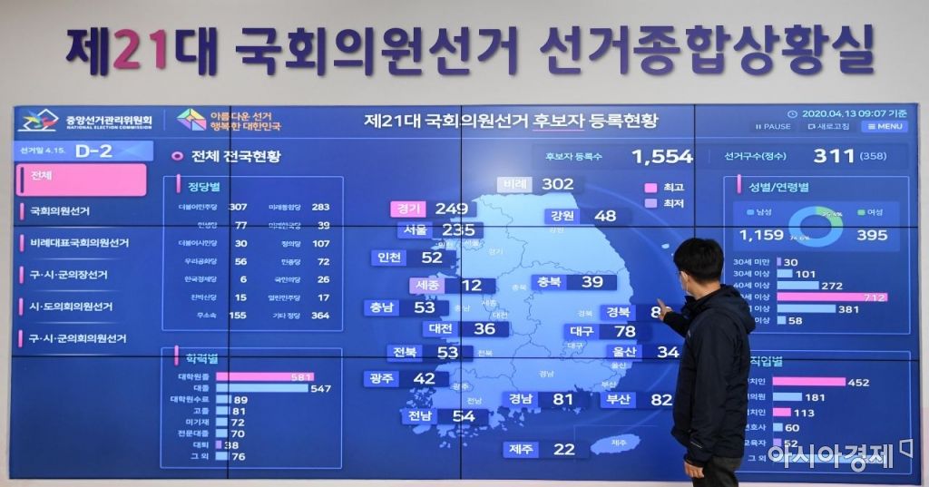 제21대 국회의원선거를 이틀 앞둔 13일 경기 과천 중앙선거관리위원회 선거종합상황실에서 관계자가 모니터링을 하고 있다./과천=김현민 기자 kimhyun81@