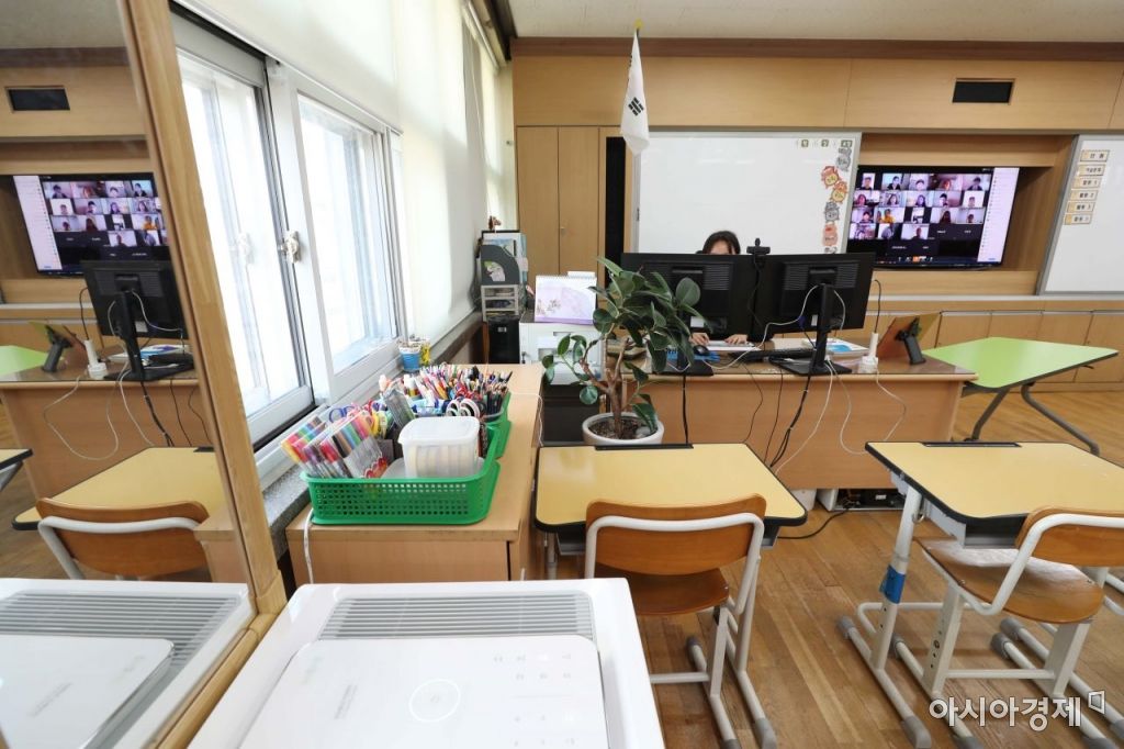 전국 고등학교 1~2학년, 중학교 1~2학년, 초등학교 4~6학년 학생들이 온라인 개학을 시작한 16일 서울 용산초등학교에서 한 교사가 쌍방향 온라인 수업을 하고 있다. /문호남 기자 munonam@