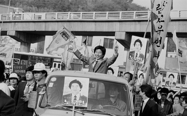 13대 국회의원 부산 동구 선거합동연설회를 마친 당시 노무현 통일민주당 후보가 자동차에 올라 지역구를 돌며 지지를 호소하고 있다. 당시 노 후보는 허삼수 민주정의당 후보와의 대결에서 승리해 국회의원으로 당선됐다. [이미지출처=연합뉴스]