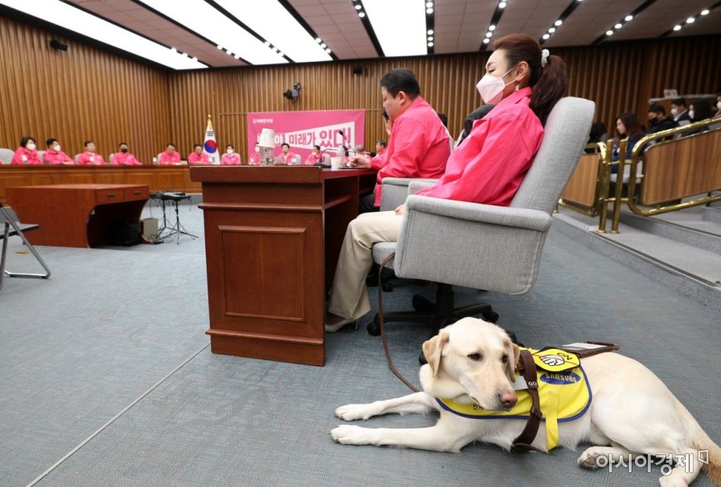 1일 국회에서 열린 미래한국당 선거대책 회의에 참석한 김예지 후보 옆에 맹인 안내견 '조이'가 앉아 있다./윤동주 기자 doso7@