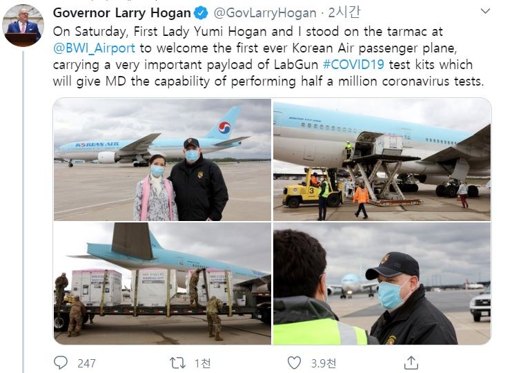 호건 주지사는 20일(현지시간) 자신의 트위터를 통해 코로나19 진단키트를 싣고 한국에서 날아온 대한항공 항공기 앞에서 부인 유미 호건 여사와 함께 찍은 사진을 공개했다