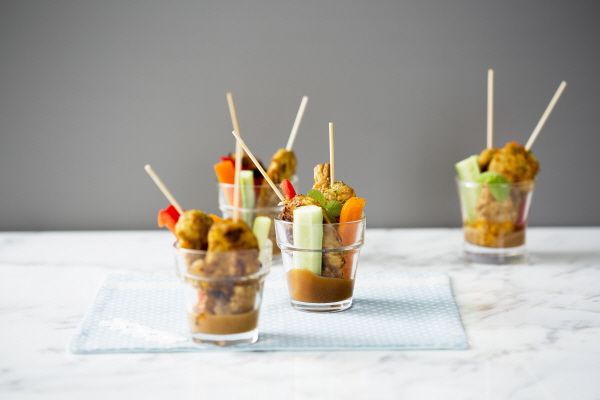 4. 컵에 피넛 월남쌈 소스를 담고 채소와 닭고기를 꽂은 다음 파슬리를 뿌린다.