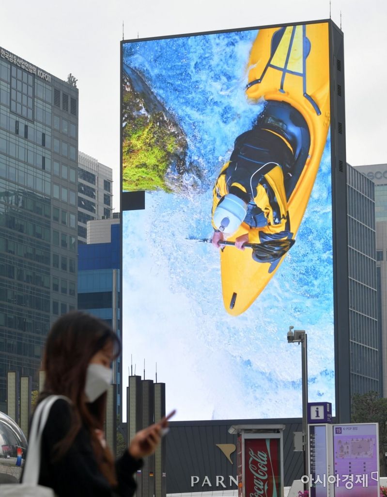 3일 서울 강남구 삼성역 인근 테헤란로에 설치된 LG전자의 초대형 LED 사이니지 앞을 시민들이 지나가고 있다. 이 사이니지는 1만 니트(nit)의 밝기를 지원해 낮에도 콘텐츠를 선명하게 보여준다. 픽셀과 픽셀 사이의 간격이 8.3㎜로 이 지역에 설치한 LED 사이니지 가운데 최고 기술력을 구현했다./윤동주 기자 doso7@
