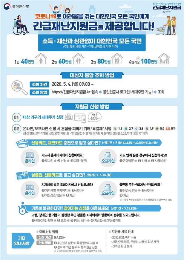 지급 액수는 1인 가구 40만원, 2인 가구 60만원, 3인 가구 80만원, 4인 이상 가구 100만원이다.