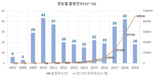 2007년~2019년 연도별 전기차 관련 전력서비스 출원동향 그래프. 특허청 제공