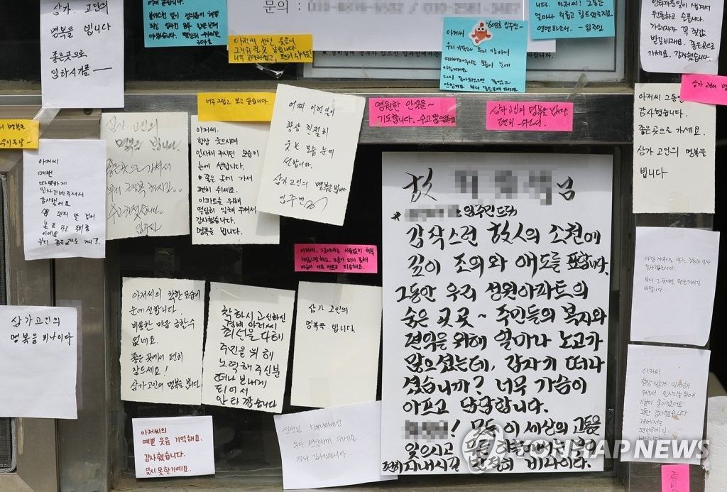 한 주민은 메모를 통해 "아무리 생각해도 우리 아파트 식구들과 함께할 수 없다는 것이 믿기지 않습니다. 너무나 마음이 아픕니다"라며 고인을 애도했다.