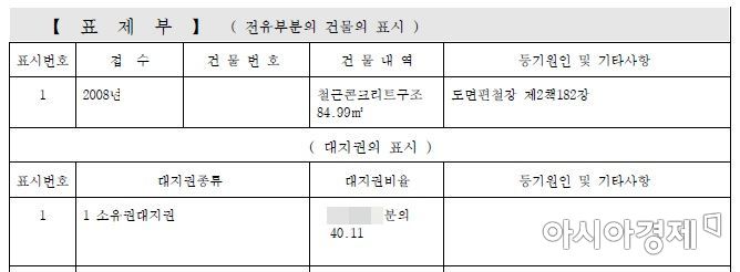 이 사진은 서울 내 한 아파트의 등기부등본 중 대지지분에 관련한 내용이 적힌 부분인데요. 이 아파트의 경우 추후 재건축을 하게 된다면 현재 84.99㎡의 전용면적을 기준으로 새 아파트 입주 시 입주 면적을 주는 게 아니라 40.11㎡가 기준이 되는 식입니다.