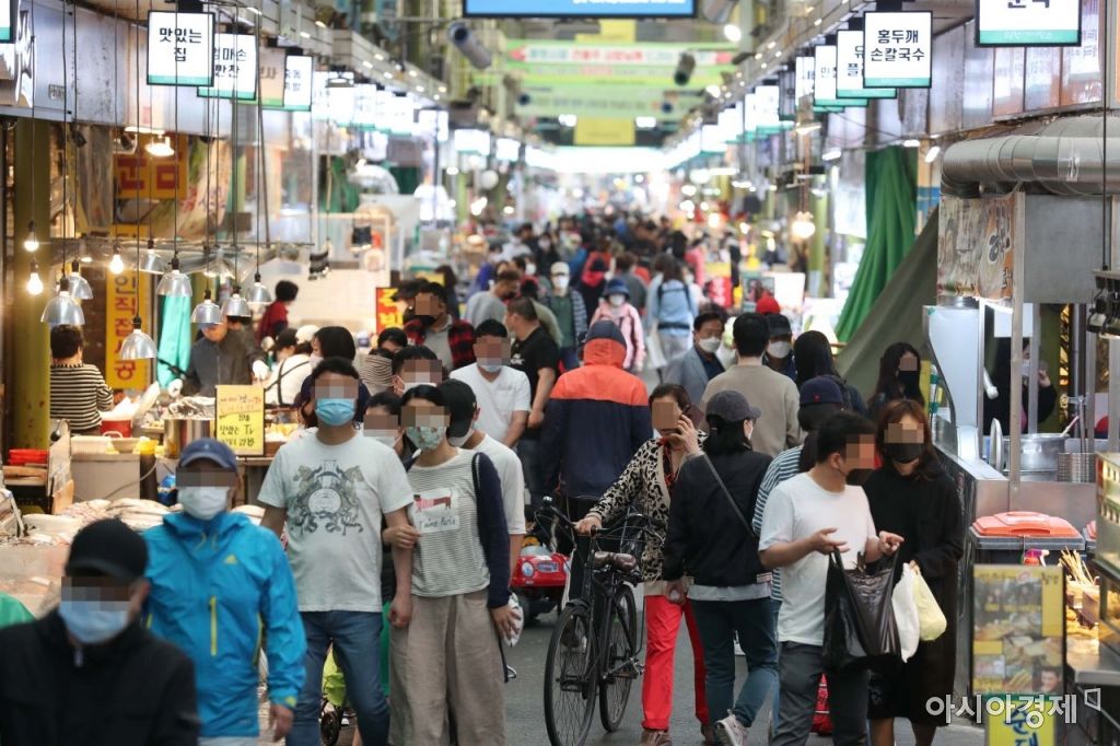 정부의 신종 코로나바이러스 감염증(코로나19) 긴급재난지원금 지급 첫 주말인 17일 서울 마포구 망원시장에서 시민들이 장을 보고 있다. /문호남 기자 munonam@