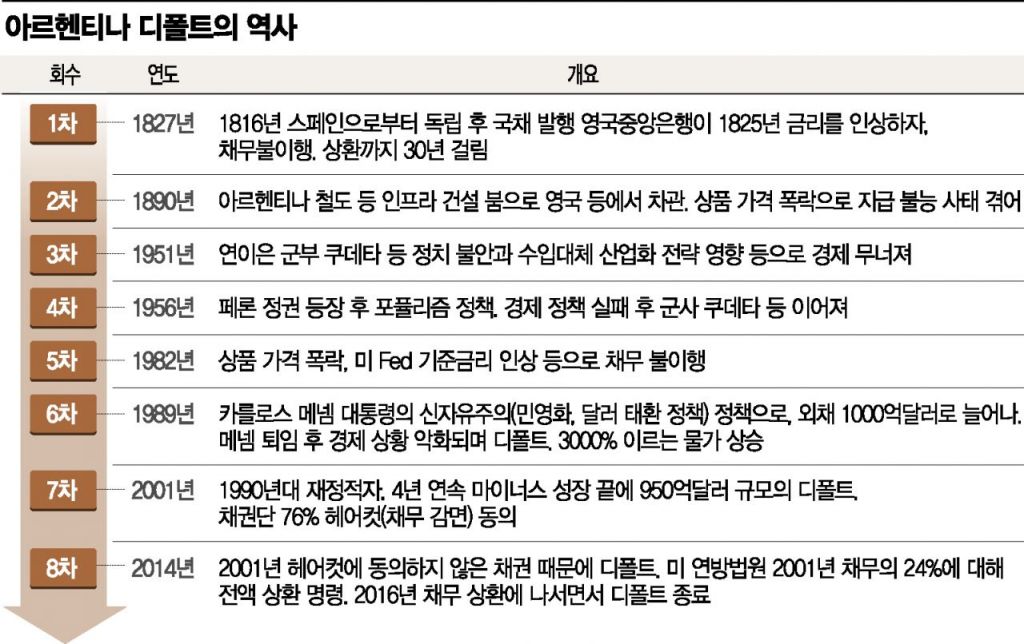 아르헨티나의 역사는 디폴트의 역사라고 해도 과언이 아니다. 1816년 독립한 이후 지금까지 디폴트 선언만 8차례를 기록했다. 첫 번째 채무불이행 선언은 1827년이었다. 독립 후 막대한 나라 재정을 마련하기 위해 영국 런던 금융가에서 국채를 발행했는데 1825년 영국중앙은행이 금리를 인상하자 디폴트를 선언한 것이다. 아르헨티나가 빌린 돈을 갚고 다시 국제 금융시장에 참여할 수 있던 것은 이로부터 30년 뒤였다. 아르헨티나의 디폴트는 그 이후 1890년, 1951년, 1956년, 1982년, 1989년, 2001년 그리고 2014년까지 이어졌다.