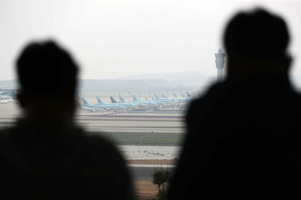 지난 18일 인천국제공항 전망대를 찾은 시민들이 공항에 멈춰 선 항공기들을 바라보고 있다. / 문호남 기자 munonam@
