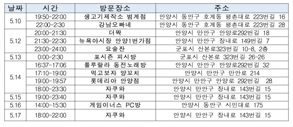 경기도 내 시설 가운데서도 클럽 방문자가 다녀간 시설을 구체적으로 공개했다. 안양과 군포 일대 식당·주점·PC방 등이다. 지난 10일 저녁 생고기제작소 범계점을 비롯해 더짝(12일 오후)·포시즌PC방(13일 새벽) 등이다.