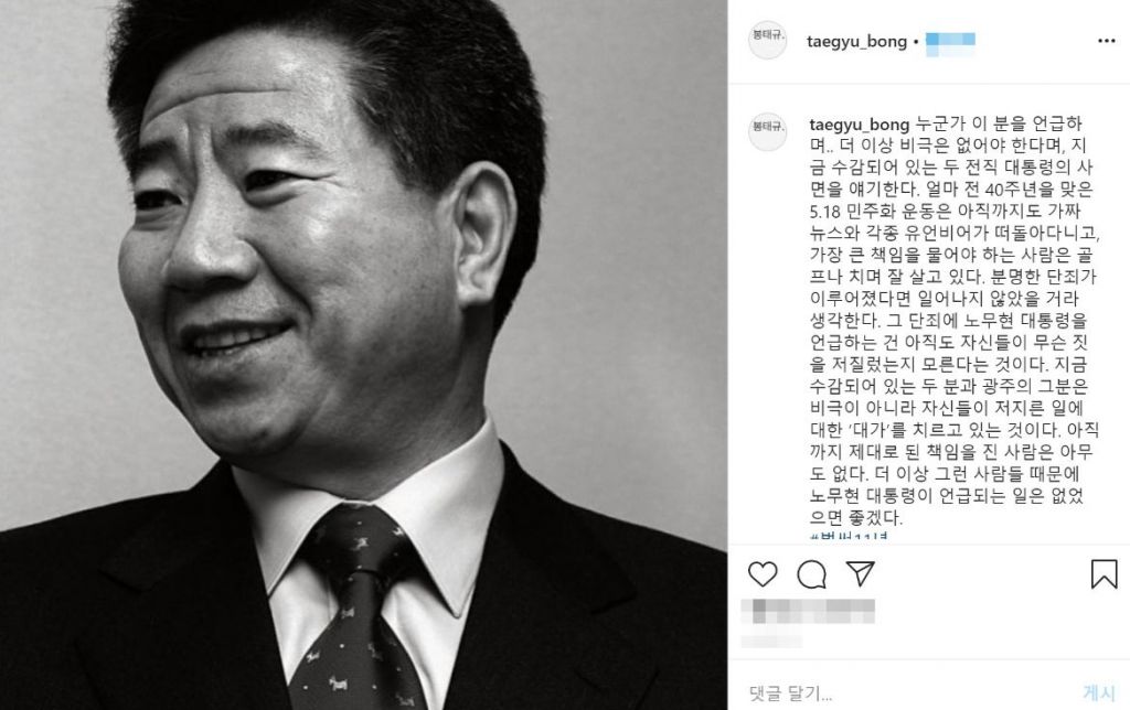 봉태규는 23일 자신의 SNS에 노무현 전 대통령의 사진과 함께 장문의 글을 게재했다.
