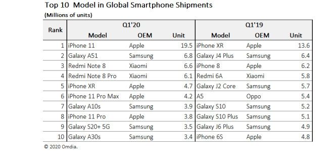 두 번째로 많이 팔린 스마트폰은 삼성전자의 갤럭시A51이다. 갤럭시A51의 출하량은 680만대를 기록했다. 10위권에 오른 스마트폰 4종 중 3종이 중저가 모델이며 갤럭시A10(390만대), A30(340만대)이 7위와 10위를 기록했다. 플래그십 스마트폰 중 갤럭시S20+ 5G(350만대)는 9위를 기록했다.