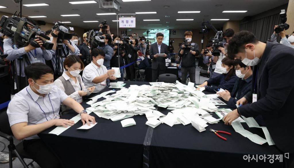 28일 오후 경기도 과천시 중앙선거관리위원회 대회의실에서 언론을 상대로 사전투표 투개표 및 개표 과정 공개 시연회가 열리고 있다./김현민 기자 kimhyun81@