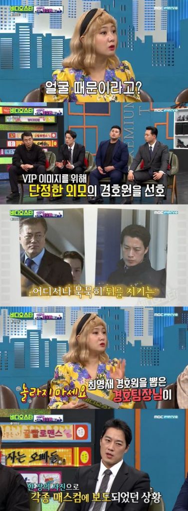 최영재는 "근접 경호를 하게 된 이유가 얼굴 때문이냐"는 박나래의 질문에 "바로 옆에 근접하게 있다 보니까 대상자의 이미지까지 표현할 수 있는 위치다"라며 "너무 우락부락하고 험악하면 안 된다"라고 말했다.