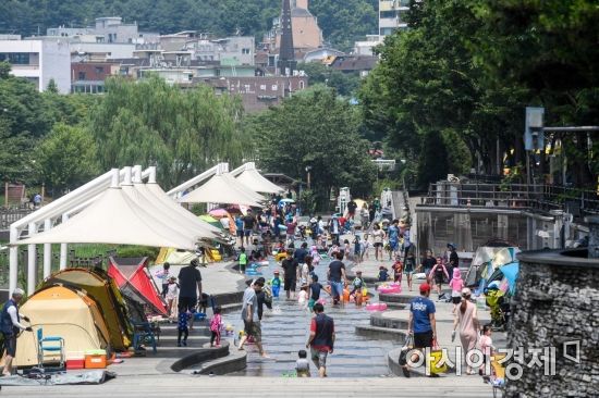 서울 한 낮 기온이 30도까지 오르며 '폭염 특보'가 발령된 24일 서울 송파구 성내천 물놀이장을 찾은 어린이들이 물놀이를하며 더위를 식히고 있다./강진형 기자aymsdream@