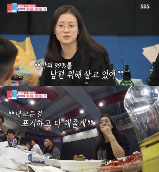 정찬성과 7년 동안 모든 순간 함께 했다는 박선영은 "내 모든 것이 정찬성에게 다 맞춰있다. 난 솔직히 99%를 다 남편을 위해 살고 있다"라면서 "연애 시절 꿈이 챔피언이란 말에 내 모든 걸 포기하고 다 해주겠다 말했다, 대신 은퇴 후 내가 원하는 대로 살아달라 하니 알겠다고 했다. 난 다 맞춰줄 거야, 다 해줄 거야"라고 말해 감동을 자아냈다.