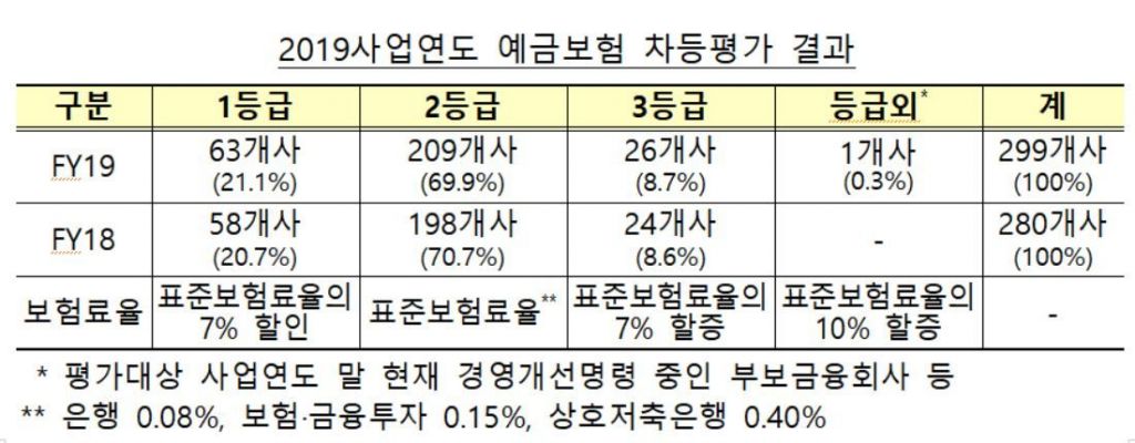 차등평가 결과 지난해보다 1·3등급 금융회사가 소폭 증가했다. 표준보험료율(은행 0.08%, 보험·금융투자 0.15%, 상호저축은행 0.40%)을 적용받는 2등급 금융회사는 209곳으로 전체의 69.9%를 차지했다. 금융사 수는 전년 198곳에서 11곳 늘었지만, 전체에서 차지하는 비중은 70.7%에서 69.9%로 약간 줄었다.