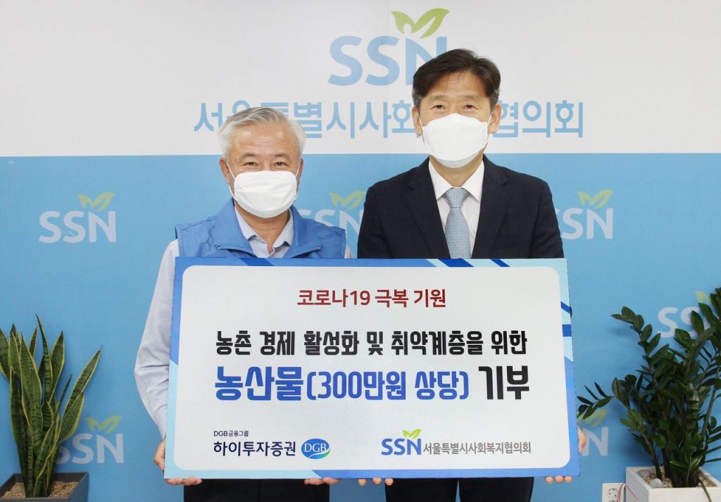 하이투자증권은 DGB사회공헌재단을 통해 준비한 후원금 300만원으로 경북 문경 영농조합에서 생산한 건강식재료인 표고버섯 분말 300개를 구매해 서울특별시사회복지협의회에 전달했다.