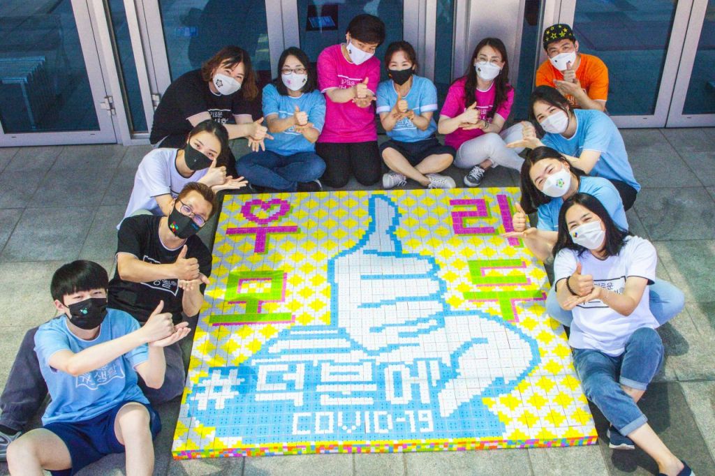참가자들은 약 1000개의 큐브를 이용해 각종 응원문구가 수놓인 대형 모자이크를 만들었다. 모자이크에는 코로나19 사태에 잘 대응하고 있는 국민과 방역에 힘쓰는 의료진을 응원하는 ‘덕분에’라는 문구를 비롯해, ‘코로나19는 코리아를 이길 수 없다’, ‘우리함께 힘냅시다’ 등의 응원 메시지가 담겼다.