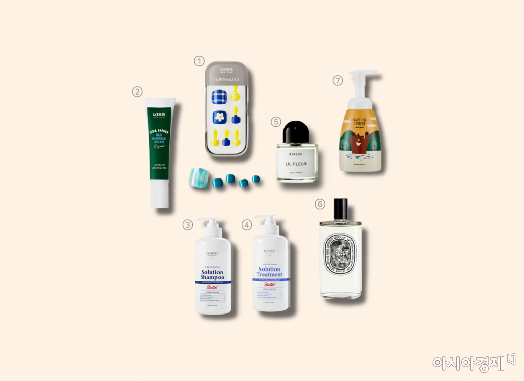 6월 출시된 헤어바디퍼퓸 신상품. (번호순)키스뉴욕 프레스앤고 썸머페디 블루글래스 에어핏 젤페디 팁, 키스뉴욕 시카에너지 네일 앰플 크림, 닥터시드 스칼프 안티 헤어로스 솔루션 샴푸, 트리트먼트, 바이레도 릴 플레르 오 드 퍼퓸, 딥티크 플레르 드 뽀 바디 앤 홈 스프레이, 더페이스샵 ‘숲 속 친구들 버블 핸드 워시’.