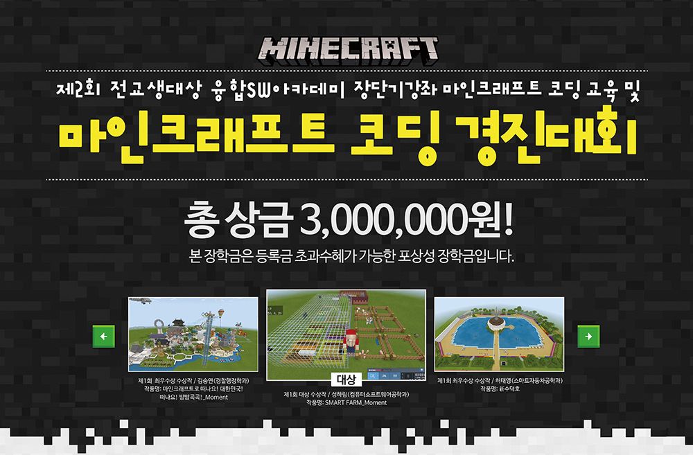23일 원광대에 따르면 체험 중심 교육으로 학생들이 코딩에 관심을 갖게 하고, 코딩 역량 강화에 목적을 둔 마인크래프트 코딩 경진대회가 2회를 맞이한 가운데 올해는 코로나19 사태로 영상을 제작해 제출하는 비대면 방식으로 진행됐다.