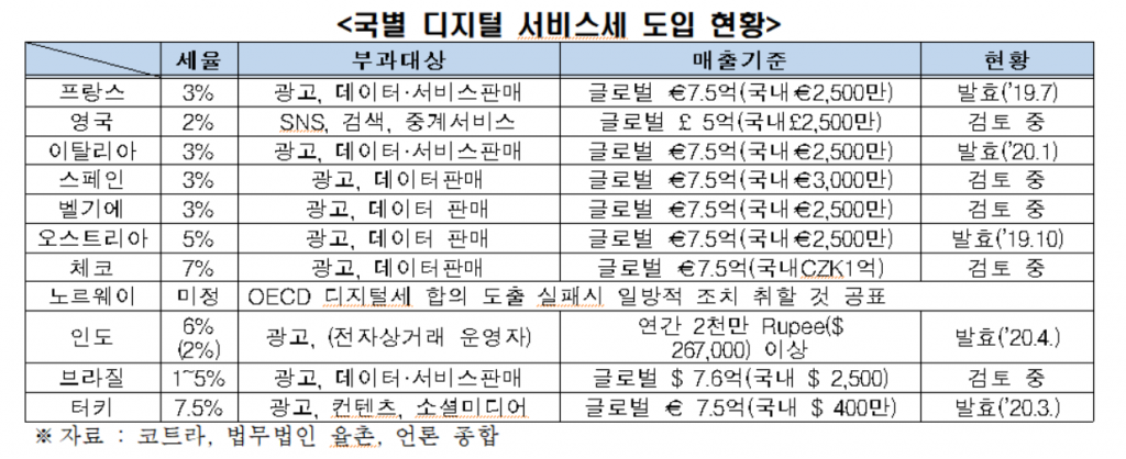 이 와중에 자체적으로 DST를 도입하는 국가가 증가하고 있다. 이미 지난해 7월 프랑스가 DST를 발효한 이래 서유럽권은 2~3%가량의 DST 도입을 검토하고 있다. 특히 오스트리아 및 체코 등 동구권은 5~7% 가량의 고율 DST를 추진 중이다. 인도, 인도네시아, 태국, 베트남 등 아시아권 국가들도 DST 혹은 이와 유사한 원천징수세를 도입했거나 도입할 예정이다.