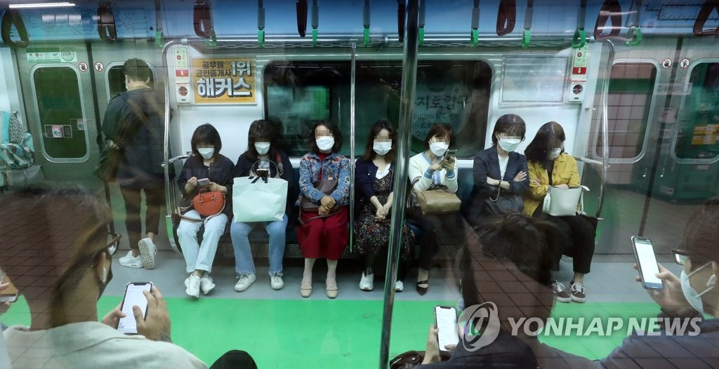 서울 지하철 2호선 열차에 마스크를 착용한 시민들이 탑승해 있다. [이미지출처=연합뉴스]