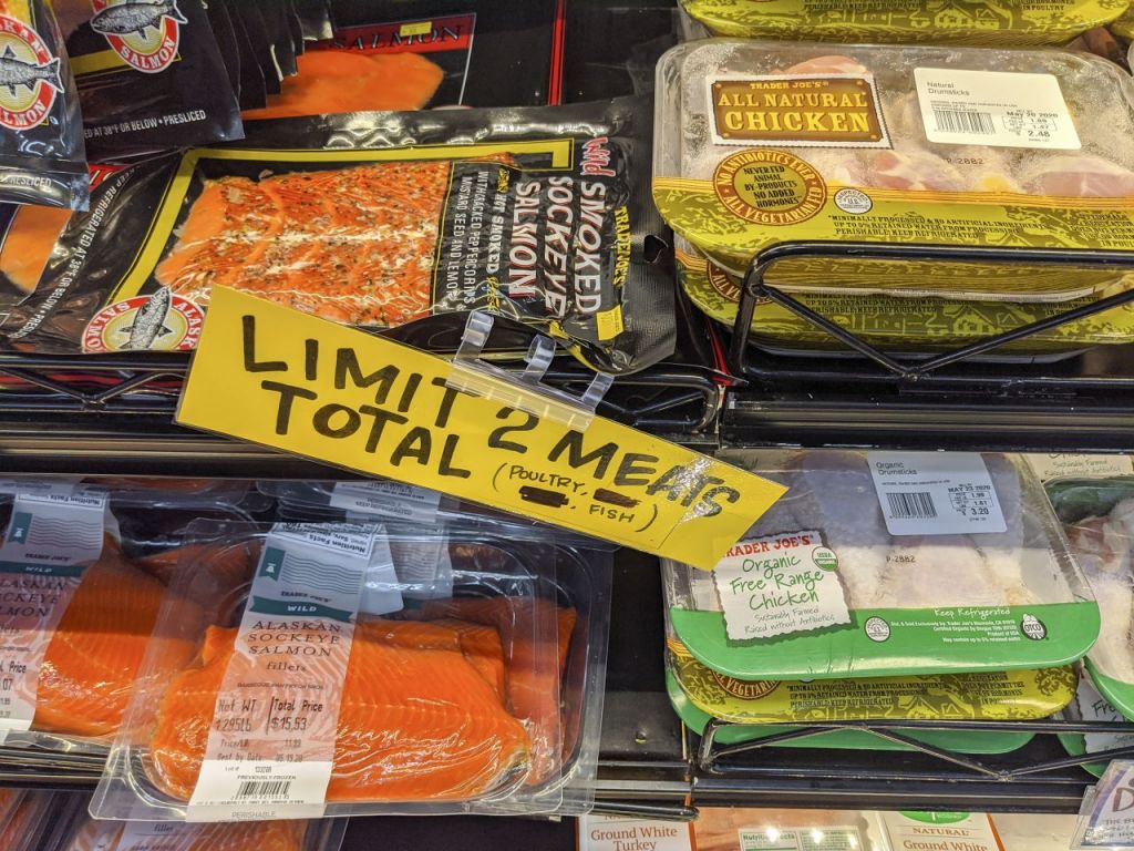 미국 로스앤젤레스의 한 상점에 진열된 연어와 닭고기. [이미지출처=AP연합뉴스]